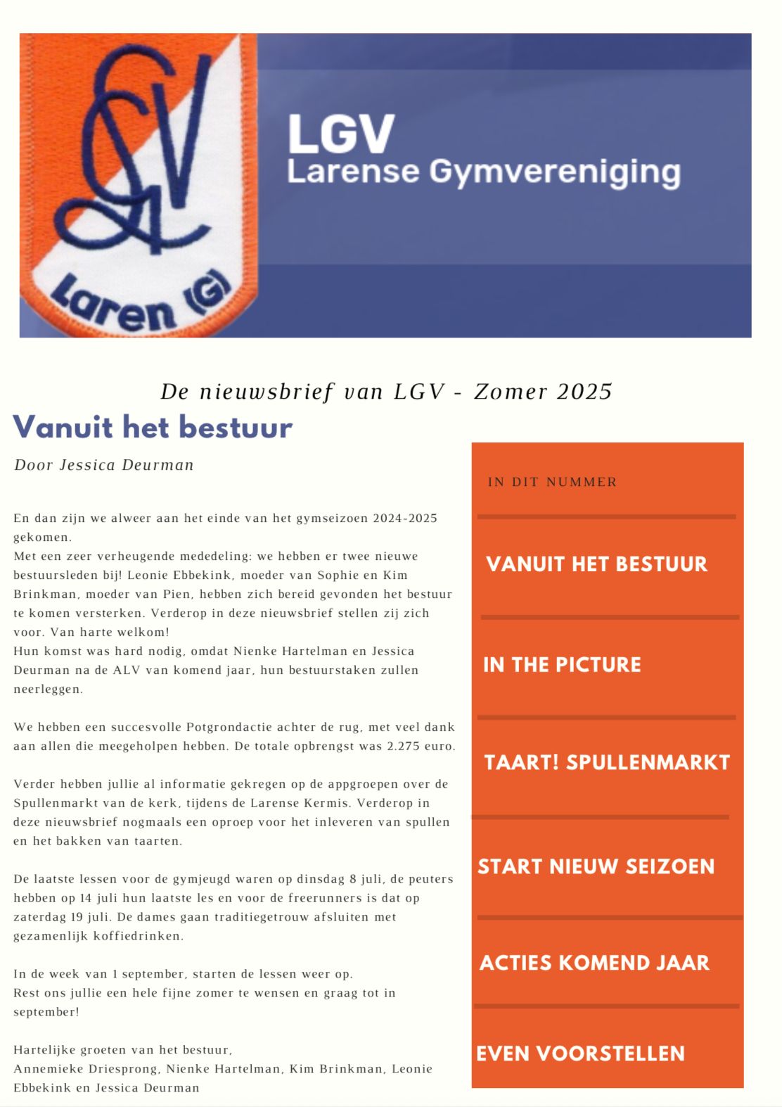 De laatste lessen voor de gymjeugd waren op dinsdag 8 juli, de peuters hebben op 14 juli hun laatste les en voor de freerunners is dat op zaterdag 19 juli. De dames gaan traditiegetrouw afsluiten met gezamenlijk koffiedrinken.